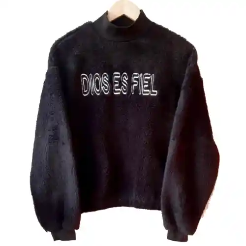 Buzo Dios es fiel para Mujer color negro y materal de peluche con bordado