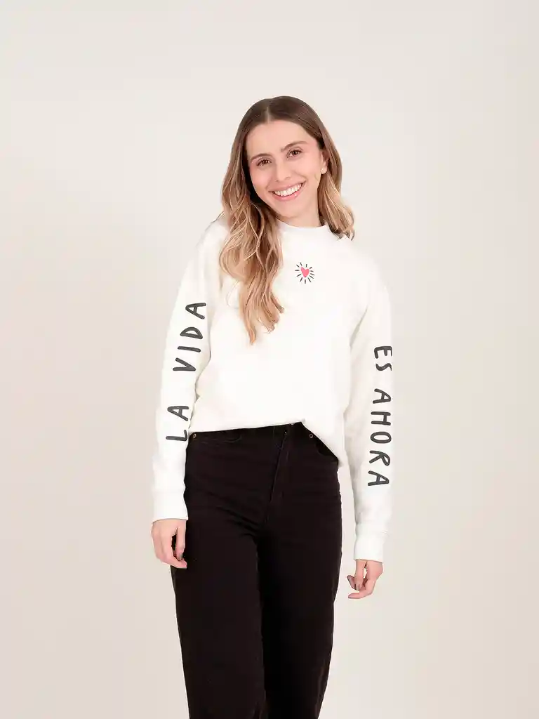 Buzo marfil cuello redondo y manga larga. Estampado en serigrafía.