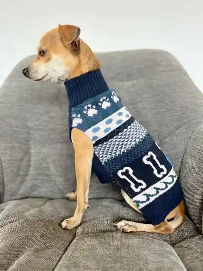 Buzo para perros y gatos, manga sisa, cuello y ruedo en resorte, ojal en lomo para trailla, tejido en fibras recicladas.