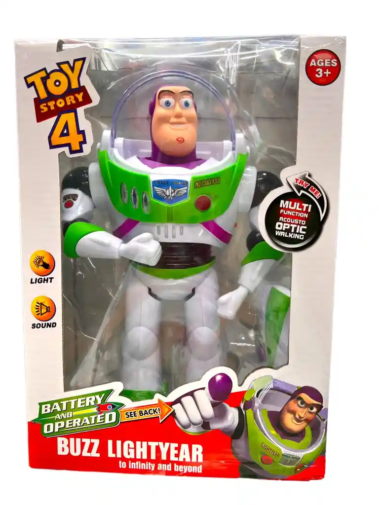 Juguete Buzz Lightyear muñeco con luz, sonido y además camina sorprende a tus hijos con este genial juguete de buzz lightyear para que vivan grandes aventuras ¡hasta el infinito y más allá! medidas: 30 cm x 17cm x 9cm La caja contiene: 1 muñeco Buzz Lightyear 1 Alas plegables. El tornillo para ajustar las alas se encuentra en la parte de atrás al lado del porta baterías.