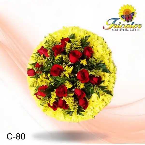 Pompon o margarita amarilla, ( color sujeto a disponibilidad). 16 Rosas Rojas ( color sujeto a disponibilidad). Flor de complemento, Aster solidago. Follaje variado Helecho, Hoja de Dracena y Pino.