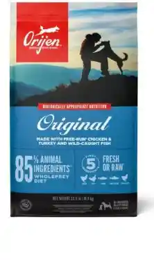 Orijen Original es una comida para perros de todas las razas en cualquier etapa de su vida. Se realiza con una deliciosa mezcla de 5 proteínas saludables: pollo, pavo, huevos, arenque y lenguado; que brindan todos las vitaminas y minerales para que tu peludo este sano y feliz. Este alimento para perros se realiza con 2/3 de proteína fresca y 1/3 de proteína deshidratada para aportar diferentes tipos de nutrientes. Se le añaden infusiones de hígado de pavo y pollo con el fin de mejorar el sabor. Ventajas 38% de proteína 19% de carbohidratos Solo se añade un suplemento: zinc Alta palatabilidad