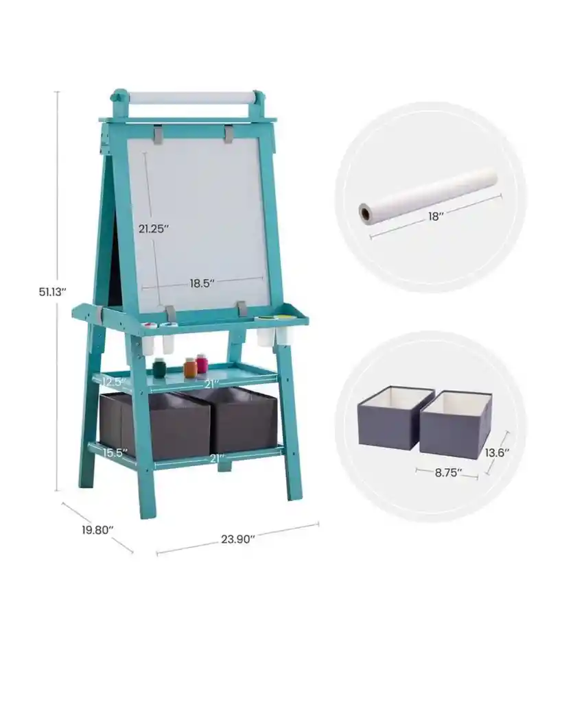 Este caballete multifuncional está diseñado para estimular la creatividad y la organización en los más pequeños: • Pizarra blanca magnética ideal para escribir, dibujar o colocar imanes educativos. Incluye el mensaje alegre “Happy Everyday!” como inspiración diaria. • Rollo de papel superior para pintar, colorear o realizar actividades artísticas sin límites. • Dos contenedores de almacenamiento decorados con adorables animales (conejo, león, cebra y oso), perfectos para guardar juguetes, marcadores, pinceles y más. • Estructura resistente en color azul brillante, llamativa y segura para niños. • Fomenta el desarrollo cognitivo y emocional a través del juego libre, la expresión artística y la organización personal.