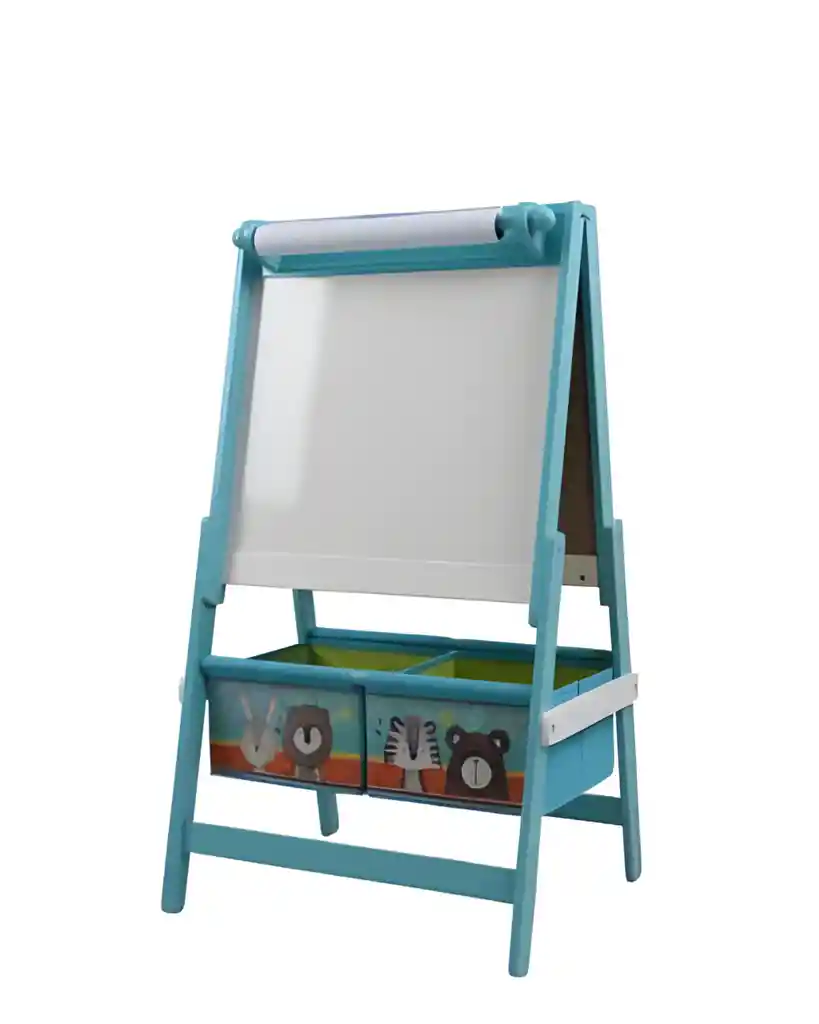 Este caballete multifuncional está diseñado para estimular la creatividad y la organización en los más pequeños: • Pizarra blanca magnética ideal para escribir, dibujar o colocar imanes educativos. Incluye el mensaje alegre “Happy Everyday!” como inspiración diaria. • Rollo de papel superior para pintar, colorear o realizar actividades artísticas sin límites. • Dos contenedores de almacenamiento decorados con adorables animales (conejo, león, cebra y oso), perfectos para guardar juguetes, marcadores, pinceles y más. • Estructura resistente en color azul brillante, llamativa y segura para niños. • Fomenta el desarrollo cognitivo y emocional a través del juego libre, la expresión artística y la organización personal.
