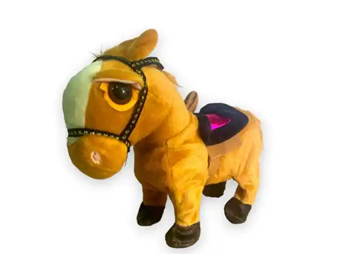 Material : Felpa Edad Mínima Recomendada : 1 a 4 años Presiona el botón y el caballo caminará, cantará y bailara Funciona con 3 pilas AA (NO INCLUIDAS)