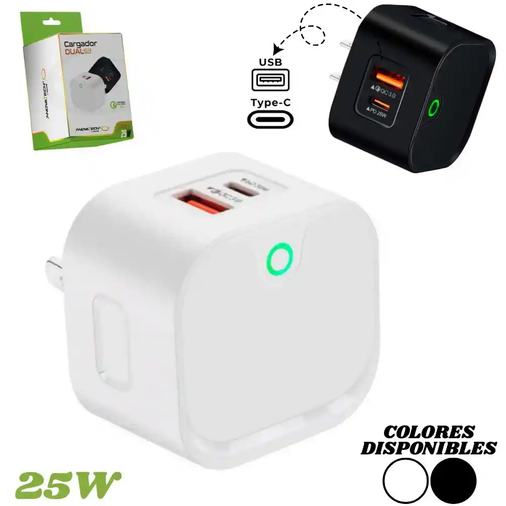 Cabezote Cargador De Pared 2 Puertos Usb Y Tipo C 25w Adaptador De Corriente Optimiza el tiempo que pasas conectado a la pared con este potente cargador dual. Diseñado para ofrecer una carga eficiente y segura, es el complemento ideal para mantener todos tus dispositivos listos para la acción en tu día a día. Colores Disponibles: Blanco y Negro. NOTA: selecciona color de preferencia, en caso de no ser seleccionado, se enviará color sujeto a disponibilidad. Características: - Carga Ultra Rápida de 25W: Equipado con tecnología Power Delivery (PD) de 25W en su puerto Tipo-C y Quick Charge 3.0 (QC 3.0) en su puerto USB estándar. ¡Recupera la batería de tu smartphone en tiempo récord! - Doble Conexión: Cuenta con un puerto USB y un puerto Tipo-C, permitiéndote conectar diferentes tipos de cables para mayor versatilidad. - Diseño Moderno y Funcional: Su estructura compacta incluye un elegante anillo de luz LED verde que te indica visualmente cuando el cargador está en funcionamiento. Especificaciones: - Potencia Máxima: 25W - Puertos de Salida: 1x USB-A (QC 3.0), 1x USB Tipo-C (PD 25W).