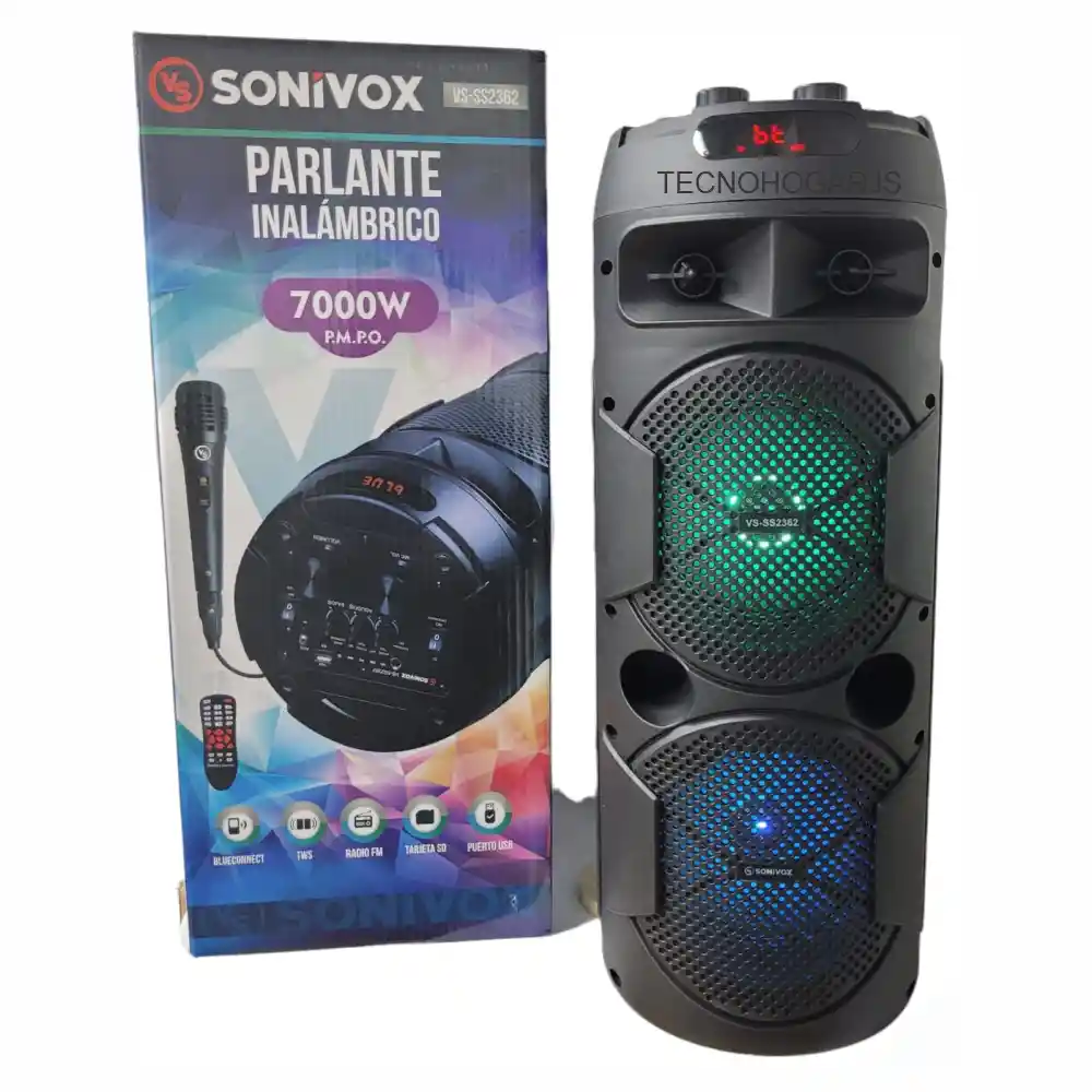 Esta columna con instalación vertical e interfaz para escuchar radio FM. Compatible con tarjeta TF y unidad flash USB. Conexión Bluetooth con una variedad de características, a saber, módulo Bluetooth, que incluye iPhone, iPod, iPad, etc. El modo AUX se puede ajustar con un tamaño estándar de 3,5 mm. (Teléfonos, tabletas, PC, reproductores, etc.) Descarga la app y controla todas sus funciones desde tu celular CARACTERÍSTICAS: Versión de Bluetooth: V4.2+EDR Ayuda USB /TF o SD/AUX micro /FM/MIC Luz de LED y pantalla LED Salida para micrófono o instrumento musical Ligera y fácil de transportar Estilo popular del cilindro Excelente salida de sonido ESPECIFICACIONES: 7000W Altavoz: 2 x 6.5' Ayuda: Bluetooth 4.2 +EDR TF, USB, AUX., FM, MIC Pantalla LED y linterna Con el botón del volumen Con el Mic y el botón del eco Con el control remoto Li-batería 4400mAh interna (3 a 5 horas de uso) Peso: 3560g Medidas Largo Ancho Alto : 27cm x 27cm x 60cm Lo que obtienes con tu compra: 1 x Parlante 1 x Micrófono Alámbrico 1 x Control Remoto 1 x Cable 1 a 1 1 x Cable de carga USB 1 x Manual Garantía de 30 Días por Defectos de Fabricación, no cubre daños ocasionados por mal uso.