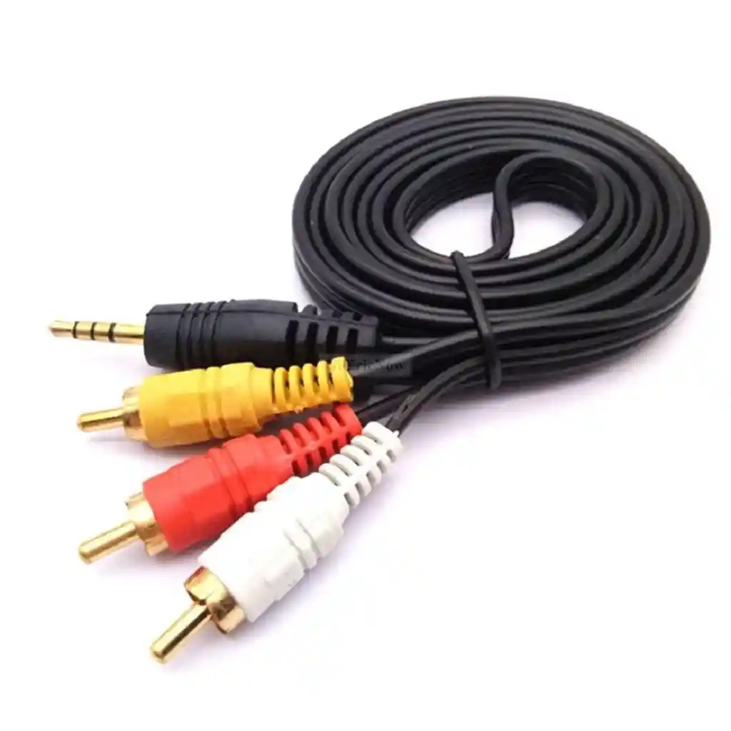 Cable Audio Video 3x1 miniplug 3.5mm a Rca video y audio stereo. Longitud: 1.5 metros. Cable Auxiliar a RCA 1X3 De 1.5m Para Audio y Video, Ideal para conectar tus consolas con salida auxiliar a RCA Para Audio y video, o también algunos reproductores portátiles de DVD. Características - De 1.5 metros - Cable de alta calidad - De Auxiliar a RCA 1X3 Para Audio y Video