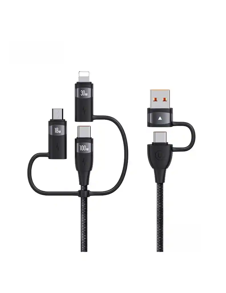 "USAMS US-SJ645 U85 USB A a Tipo C a Tipo C más 8pin más micro 6 en 1 PD 100W Cable de Datos de Aleación de Aluminio de Carga de 1.2m Negro salida de alta potencia de 100w, carga completa extremadamente rápida entrada dual y tres salidas, diseño 6 en 1, soporte para dispositivos convencionales en el mercado hilo tejido de arco iris de alta densidad, magia para un fácil almacenamiento Especificación: Material: Tpe más aleación de Aluminio más cable Trenzado USB a Tipo-c: 18w (max) USB a 8pin: 12W (Max) USB a Micro: 18W (Max) Tipo C a Tipo C: 100W (Max)"