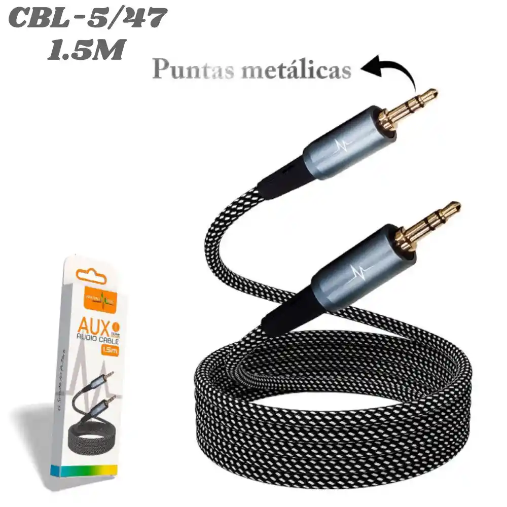 Cable Auxiliar 1 X 1 Estereo Plug 3.5mm 3 Metros CBL-5/47 (1.5M) Conecta tu música en cualquier lugar con este cable 1X1, la solución práctica, versátil y de alta calidad para enlazar tus dispositivos de audio. Diseñado para ofrecer una transmisión de sonido clara y sin interferencias, este cable es ideal para reproducir tu música favorita en el coche, altavoces, auriculares, o cualquier equipo compatible con entrada auxiliar de 3.5mm. Características: -Sonido de alta calidad. -Perfecto para todos tus dispositivos. -Largo: 1.5 Metros. -Cable: Acordonado.