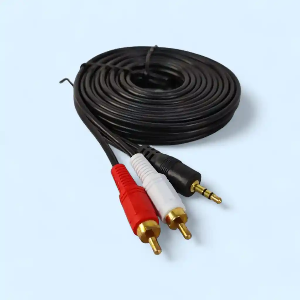 Cable de audio 2 RCA a plug 3.5 mm de 5 metros, diseñado para transmitir sonido estéreo de forma clara y estable. Ideal para conectar celulares, computadores, tablets o reproductores de audio a equipos de sonido, televisores, amplificadores y bafles con entrada RCA. Su longitud extendida permite mayor comodidad y flexibilidad en la instalación, sin pérdida notable de calidad de audio. Características principales: Tipo: Cable auxiliar de audio Conectores: 2 RCA (rojo/blanco) a plug 3.5 mm Longitud: 5 metros Audio estéreo Conexión estable y segura Material resistente y flexible Usos recomendados: Conectar celular o PC a equipo de sonido Televisores a parlantes o amplificadores Reproductores MP3, DVD, consolas y bafles Sistemas de audio para hogar u oficina Importante: Incluye únicamente el cable