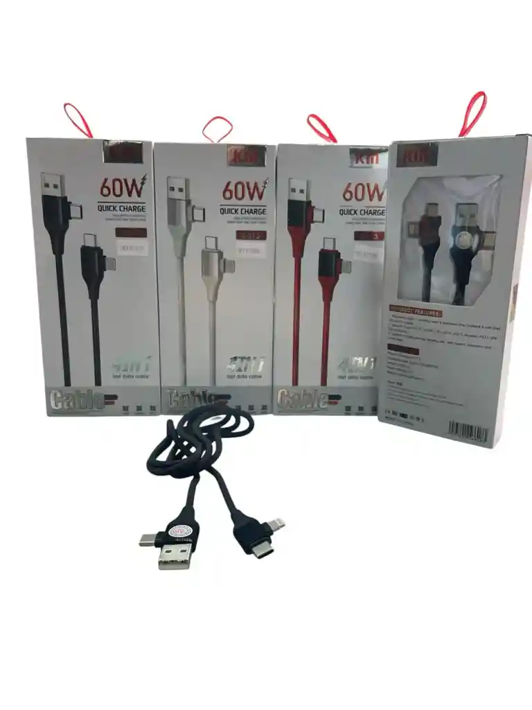 Potencia de 60W. Carga rápida y transferencia de datos de alta velocidad. Conectores USB-C a Tipo C y Lightning (iPhone). Diseño versátil y funcional.