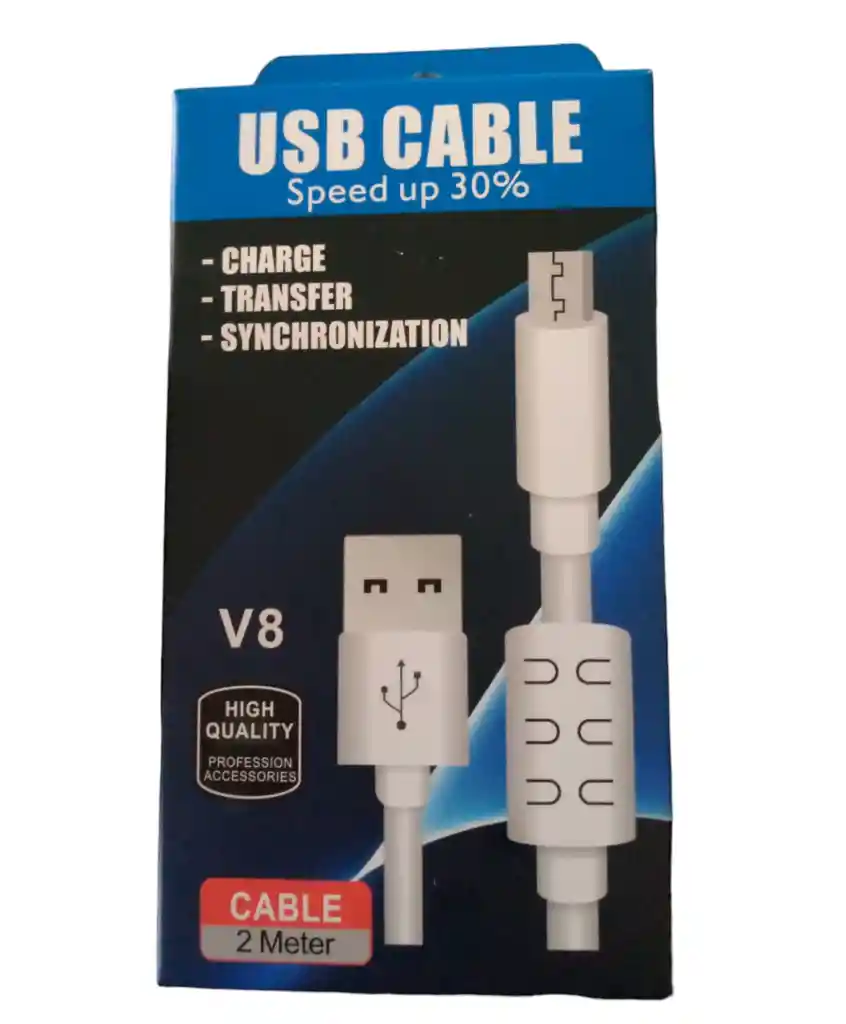 Descripción Cable V8 Con Filtro V8-USB 2.0 Blanco 2mts Protección Antiestática Cable USB 2.0 V8 Con Filtro Carga Y Transferencia De Datos Cable de uso rudo con protección anti estática, sobretensión, variaciones de voltaje y corto-circuitos. Seguro y confiable. Compatible con teléfonos móviles y tabletas. Carga y transferencia de datos.