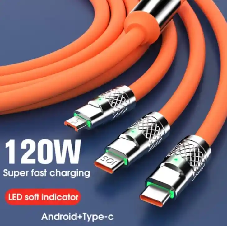 Cable de Datos y Carga Rápida 3 en 1: Versatilidad y Eficiencia en un Solo Cable Experimenta la máxima conveniencia y versatilidad con nuestro Cable de Datos y Carga Rápida 3 en 1. Diseñado para satisfacer todas tus necesidades de carga y transferencia de datos, este cable es tu solución universal para mantener todos tus dispositivos listos y operativos. Características Destacadas: Compatibilidad Universal 3 en 1: Este cable cuenta con tres salidas diferentes: Lightning, Tipo C y USB 2.0, lo que lo hace compatible con una amplia gama de dispositivos, desde iPhones hasta dispositivos Android y más. Carga Rápida de Alta Potencia: Con una capacidad de hasta 120W y 6A, este cable ofrece una carga ultrarrápida, asegurando que tus dispositivos estén listos en poco tiempo para tus actividades diarias. Indicador LED de Estado: Equipado con una luz LED indicadora Longitud Óptima y Calidad Superior: Con 1.2 metros de longitud, este cable ofrece comodidad y flexibilidad sin sacrificar calidad. Fabricado con materiales de alta calidad que garantizan un rendimiento excepcional y una durabilidad superior. Beneficios Adicionales: Versatilidad Total: No solo carga tus dispositivos, sino que también permite transferir datos rápida y eficientemente entre dispositivos compatibles. Diseño Inteligente y Seguro: Equipado con protecciones avanzadas que previenen sobrecargas, cortocircuitos y picos de corriente, garantizando la seguridad de tus valiosos dispositivos. Este Cable de Datos y Carga Rápida 3 en 1 es la solución perfecta para aquellos que buscan practicidad, rendimiento y eficiencia en un solo cable. No te limites a un solo tipo de conexión, opta por la versatilidad y el rendimiento que este cable universal puede ofrecerte en tus cargas y transferencias de datos diarias.
