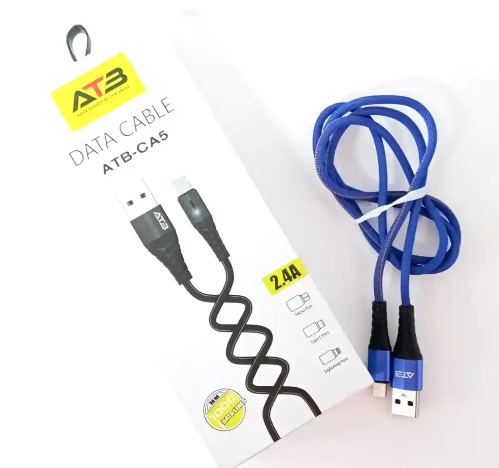 CABLE DE CARGA MARCA ATB CON ENTRADA USB A Y SALIDA LIGHTNING. CONECTA TUS DISPOSITIVOS Y TRANSFIERE TUS DATOS CON FACILIDAD.