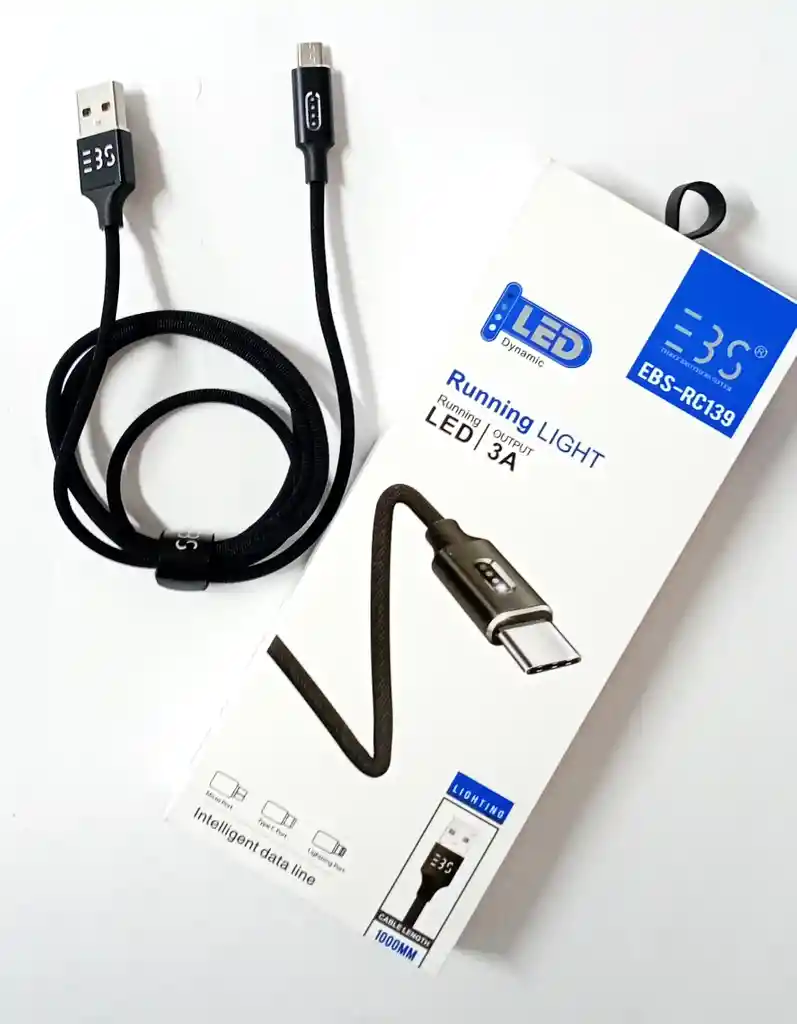 CABLE DE CARGA MARCA EBS CON ENTRADA USB A Y V8. CONECTA TUS DISPOSITIVOS Y TRANSFIERE TUS DATOS CON FACILIDAD.