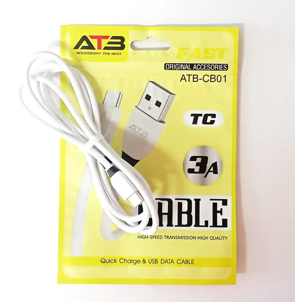 CABLE DE CARGA MARCA ATB CON ENTRADA USB A Y SALIDA TIPO C. CONECTA TUS DISPOSITIVOS Y TRANSFIERE TUS DATOS CON FACILIDAD. CABLE ENCAUCHETADO LONGITUD 1MT