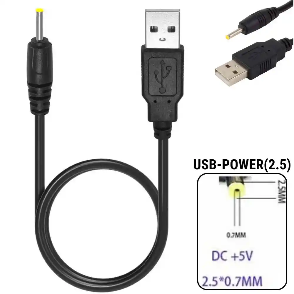 Cable de carga Usb 2.5 Cable De Poder. Con este Cable Adaptador USB a Punta Redonda de 2.5, puedes volver a cargar tus dispositivos fácilmente conectándolos a cualquier puerto USB, ya sea de tu computador, Power Bank o el cubo de carga de tu celular. Es la solución práctica y económica para reemplazar cables dañados. Características: - Punta Fina (2.5mm): Diseñado con un conector tipo barril de 2.5 mm de diámetro exterior y 0.7 mm interior. - Carga USB: Convierte cualquier puerto USB estándar en una fuente de energía. Ideal para cargar en el carro, o en la oficina con el PC. Especificaciones: - Entrada: USB Macho. - Salida: Plug Redondo. - Medida Punta Exterior: 2.5 mm. - Medida Interior: 0.7 mm. - Solo carga: No transfiere datos.
