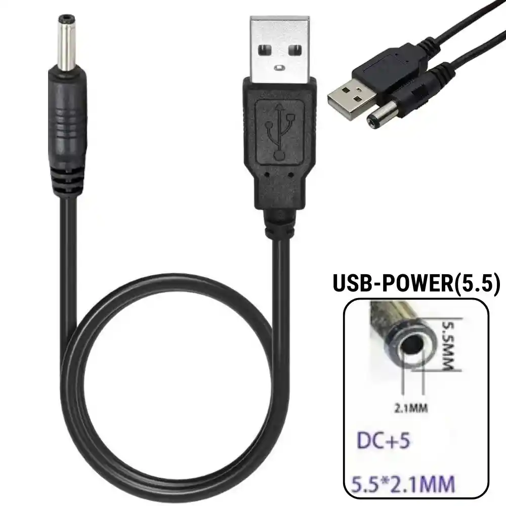 Cable de carga Usb 5.5 Cable De Poder. Con este Cable Adaptador USB a Punta Redonda de 5.5, puedes volver a cargar tus dispositivos fácilmente conectándolos a cualquier puerto USB, ya sea de tu computador, Power Bank o el cubo de carga de tu celular. Es la solución práctica y económica para reemplazar cables dañados. Características: - Punta Fina (5.5mm): Diseñado con un conector tipo barril de 5.5 mm de diámetro exterior y 2.1 mm interior. - Carga USB: Convierte cualquier puerto USB estándar en una fuente de energía. Ideal para cargar en el carro, o en la oficina con el PC. Especificaciones: - Entrada: USB Macho. - Salida: Plug Redondo. - Medida Punta Exterior: 5.5 mm. - Medida Interior: 2.1 mm. - Solo carga: No transfiere datos.