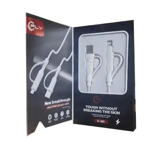 🔌📱 CABLE DE DATOS FLY TRIPLE PUERTO 60W USB / TIPO C / IPHONE – Ref: K-160 Un solo cable para todos tus dispositivos. El cable de datos FLY K-160 cuenta con triple puerto (USB, Tipo C y conector para iPhone), permitiéndote cargar y transferir datos de diferentes dispositivos con un solo accesorio. Su potencia de hasta 60W garantiza una carga rápida y eficiente. ⭐ Características destacadas: Triple puerto: USB, Tipo C y iPhone. Potencia de 60W para carga rápida. Ideal para celulares, tablets y otros dispositivos. Diseño resistente y duradero. Práctico para uso diario, viajes y oficina. Simplifica tu día a día con un solo cable para todo. ¡Versátil, potente y confiable!