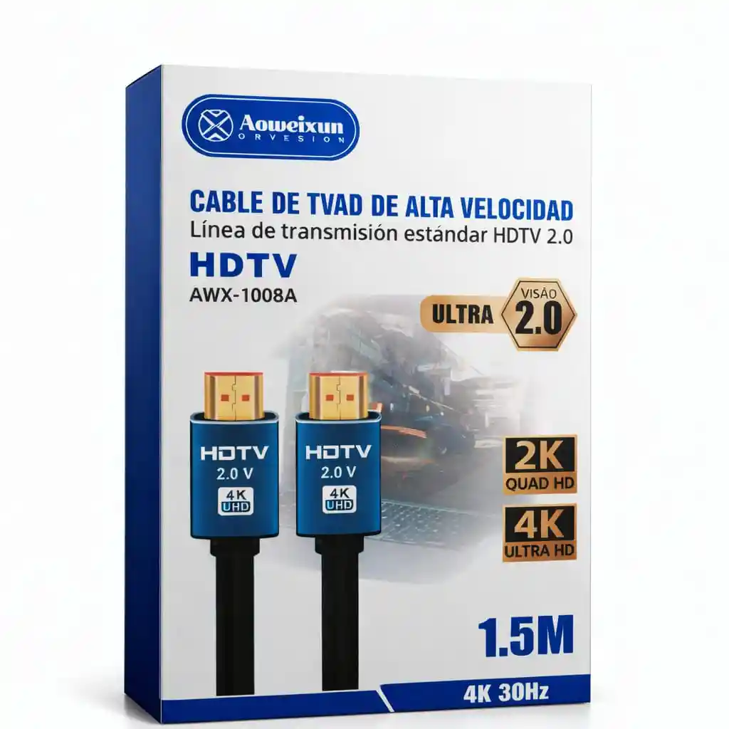 Cable HDMI de alta velocidad versión 2.0 diseñado para ofrecer una transmisión de audio y video de alta calidad. Permite disfrutar contenido en resolución 4K Ultra HD, ideal para conectar televisores, monitores, consolas de videojuegos, computadores y reproductores multimedia. Gracias a su diseño de 1.5 metros de longitud, brinda la distancia perfecta para conectar dispositivos sin perder calidad de señal. Este cable soporta resoluciones 2K y 4K, ofreciendo una imagen más nítida, colores más vivos y una mejor experiencia visual. Características • Tipo de cable: HDMI 2.0 • Resolución compatible: 2K Quad HD y 4K Ultra HD • Frecuencia: hasta 4K 30Hz • Longitud: 1.5 metros • Transmisión de audio y video digital • Conectores resistentes para mejor durabilidad • Señal estable y de alta calidad Compatible con • Televisores Smart TV • Monitores • Computadores y laptops • Consolas de videojuegos • Proyectores • Reproductores multimedia Contenido del paquete • 1 Cable HDMI 2.0 de 1.5 metros