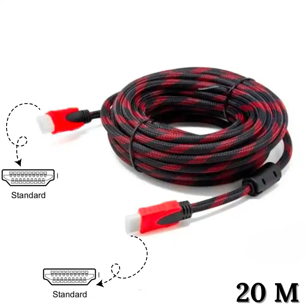 CABLE HDMI 20 METROS PUNTA DORADA DOBLE FILTRO MALLADO V1.4 El cable mallado ofrece una mejor protección contra los parásitos ("interferencias") del exterior, además el cable mallado de la foto tiene núcleos de ferrita (los 2 cilindros negros), que ayudan aún más a proteger los cables de cobre contra los parásitos. CABLE HDMI 20 METROS BLINDADO V 1.4 SOPORTE 3D 4K -Nuevo modelo forrado en fibra, con blindaje electro magnético y puntas reforzadas. -Cable Ultra HD (4k) HDMI 1.4a / compatible con HDMI 2.0 con Ethernet (conexión de componentes AV con ARC Audio Return Channel / (canal de retorno de audio) y soporte 3D. -Compatible con HDMI 2.0 / Soporte completo de ULTRA HD 4k - 2160p (4096 × 2160 píxeles). -Forrado en fibra y microfibra para alargar la vida útil del producto. -Blindaje para evitar interferencias y fallas en la transmisión de la señal. -Puedes transmitir audio digital, video digital, Ethernet, etc. -Video en 4K, tan alta definición que solo se utiliza en las pantallas de cine. -El blindaje a diferencia de los cables de plásticoprovee mayor resistencia a la tensión, a la torsión y además protege la señal que es transmitida por los cables gracias a que adicional al blindaje físico también tiene blindaje electromagnético. -Es compatible con cualquier dispositivo HDMI. Resolución hasta de 1080p y es compatible con imágenes 3D. El cable HDMI transporte video y audio sin generar diferencias de tiempo.
