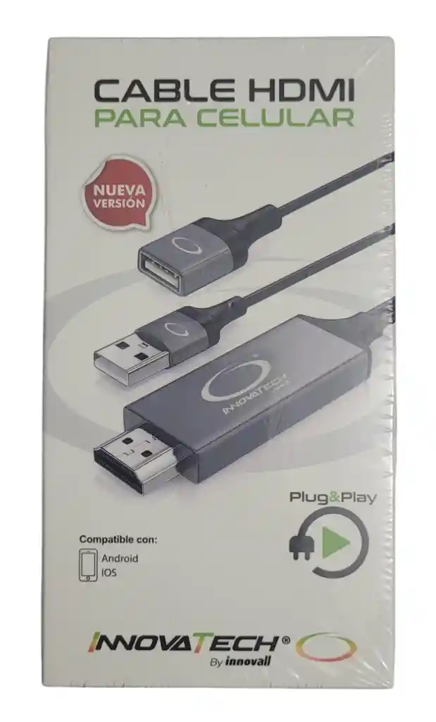 Disfruta de los mejores contenidos de tu celular directamente en la pantalla de tu televisor o proyector con este excelente cable convertidor INNOVATECH. Lo conectas a tu celular con tu cable de datos y al otro extremo lo conectas a la entrada HDMI de tu TV o proyector. Puedes proyectar cualquier contenido que tengas en tu celular, como videos, fotos, juegos, navegación, etc Características: .Conector de salida HDMI .Conector USB de entrada compatible con cables de datos estándar. .Alimentación: Requiere 5V 1A, normalmente se conecta al puerto USB de tu TV. .Resolución máxima HDMI: 1080p •Reproduce la imagen de tu iPhone o teléfono Android en tu Tv .Trabaja con, Micro USB, tipo C y lightning .Puede carga tu celular mientras reproduces al mismo tiempo (requiere cargador o powerbank USB) .Recibe notificaciones mientras ves tus videos .Solo conecta y empieza a reproducir en tu televisor.