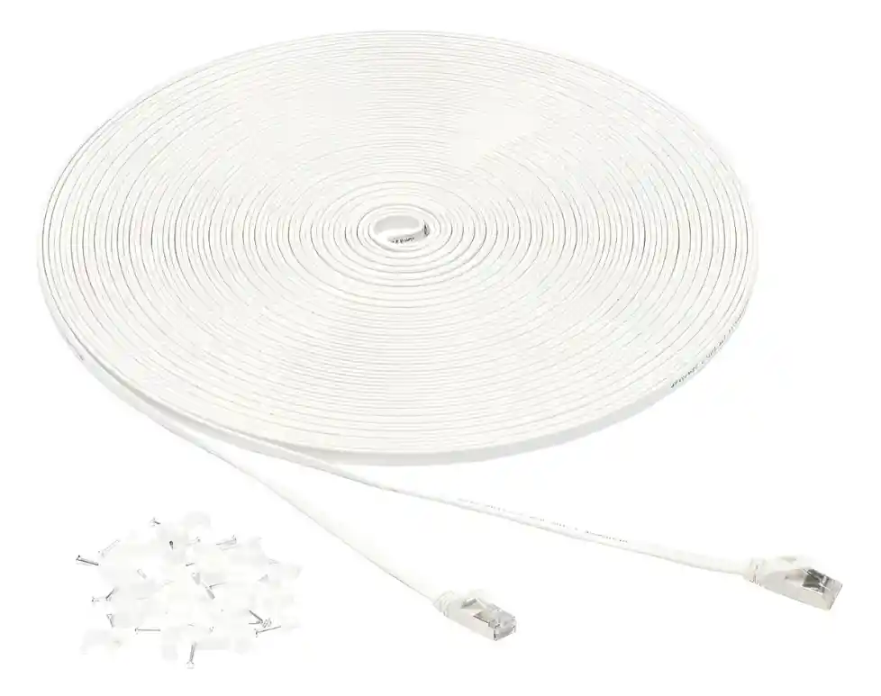 EN LA CAJA: Cable de Internet de parche Ethernet Gigabit STP Cat-7 de 100 pies, más 25 clavos para asegurar en su lugar CONVENIENTE: Conecte fácilmente dispositivos en red como computadoras, impresoras, enrutadores y más CONECTORES RJ45: Garantiza la conectividad universal Ancho de banda de 600 MHz ENCHUFE SIN CONEXIÓN: Ayuda a prevenir daños al enchufar y desenchufar el cable DISEÑO DURADERO: Los contactos chapados en oro y los conductores de cobre desnudo mejoran la integridad de la señal y resisten la corrosión CARACTERÍSTICAS: Chaquetas protectoras flexibles de PVC, calibre conductor de 32 AWG y diámetro exterior de 2.3 x 7.3mm PERFIL PLANO: Permite una instalación más limpia y segura Rendimiento de alta velocidad: el cable Ethernet Folishine de 100 pies de largo y de alta velocidad proporciona un rendimiento perfecto de ancho de banda de 600 MHz y transferencia de datos de alta velocidad de 10 Gbps, más rápido que cat5e, cat5 y cat6. No te preocupes por retrasos en la red al jugar, transmitir videos HD. Estabilidad y durabilidad: este cable Ethernet cat7 está hecho de material de alta calidad. Conector RJ45 chapado en oro de 50 micras y 4 pares de alambre de cobre trenzado blindado para garantizar un rendimiento preciso cada par trenzado contiene un cable de tierra que puede reducir eficazmente la estática y las interferencias. Los cables Ethernet rápidos ofrecen la mejor protección contra interferencias EMI/RFI y la más alta fidelidad y fiabilidad para una larga duración. Gran compatibilidad: el cable Ethernet cat7 se puede utilizar con enrutadores WiFi, Xbox One, centro de datos de computadora, servidor de nube, reproductores de medios de red, PS4, puertos y otros dispositivos con conectores RJ45. Además, este cable de internet también puede ser compatible con cat5e, cat5, cat6 y es mucho más rápido que ellos. Diseño flexible: la característica plana de este cable LAN lo hace muy flexible y permite una instalación más limpia y segura. Te facilitará hacer que el cable de red corra a lo largo de las paredes, se ajuste a los bordes y las esquinas o se deslice debajo de una alfombra. Evita eficazmente enredos y ahorra espacio. Certificado profesional: todos los cables Ethernet largos pasan por la prueba profesional Fluke. Los cables Folishine cat7 son impermeables, duraderos y resistentes a los tirones para trabajos pesados. Adecuado tanto para uso en exterior como en interior con una vida útil más larga.