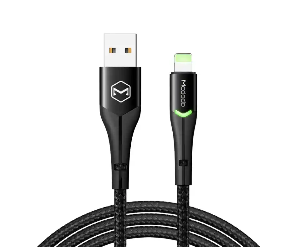 Cable de datos Lightning serie Mcdodo Peacock. Gracias a su longitud de 1,8 m es adecuado para camiones, automóviles para familias o para personas que a menudo cargan y tienen un enchufe lejano y necesitan hacer llamadas mientras se cargan. Material: TPE + aleación de aluminio + nailon Función: carga y sincronización de datos Diseño reversible para USB AM