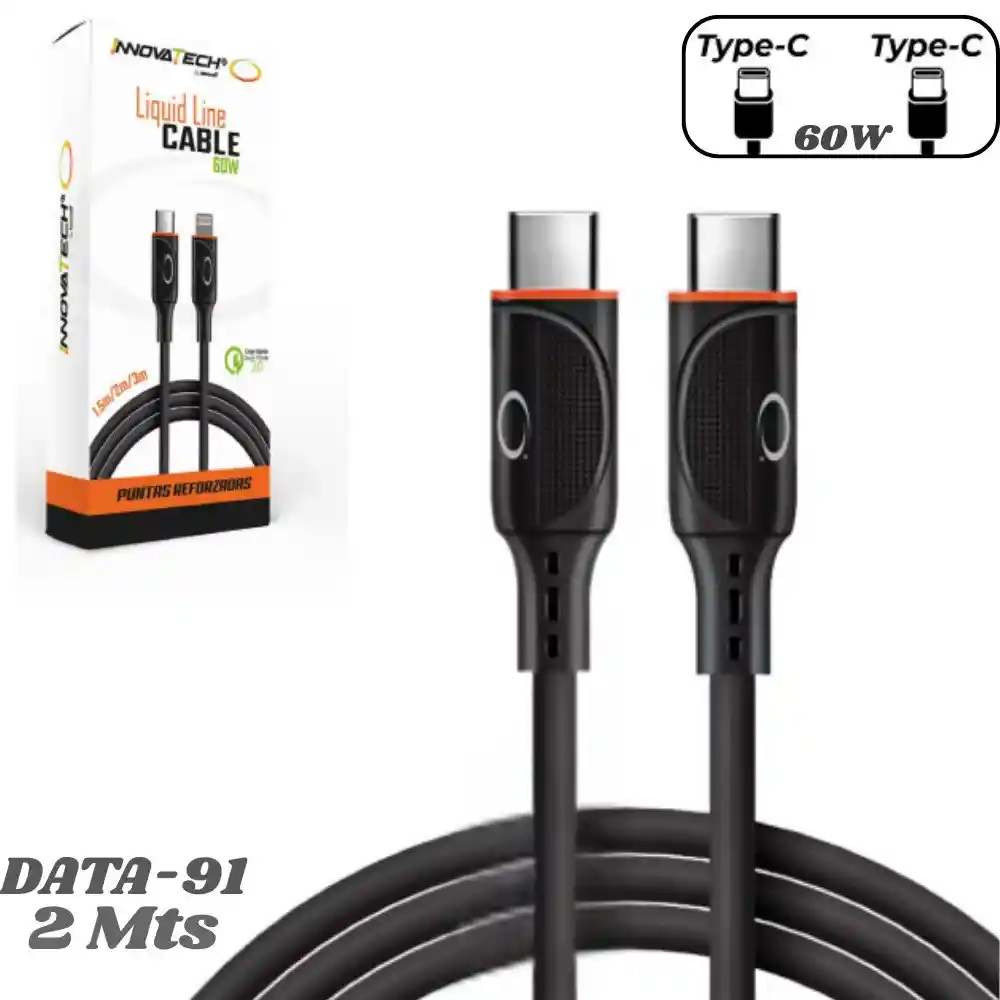 Cable Tipo C A Tipo C 2 Metros 60w Alta Calidad Innovatech Data-91 Potencia y durabilidad se combinan en el Cable de Carga Tipo C. Diseñado para quienes buscan una carga rápida y eficiente, este cable es el accesorio perfecto para mantener tus dispositivos siempre listos. Características: - Carga Rápida 60W: Este cable permite una carga rápida, optimizando el tiempo de recarga de tus dispositivos compatibles, ideal para aquellos que tienen un estilo de vida ajetreado. - Diseño Resistente: Su diseño robusto resiste alta presión y es anti-interferencia, lo que garantiza un funcionamiento óptimo incluso en condiciones exigentes. - Practicidad en el Uso: Ideal para cargar en casa, en la oficina o mientras viajas, su longitud de 2 metros proporciona flexibilidad y comodidad. Especificaciones: - Conector: Tipo C - Tipo C. - Longitud: 2 metros