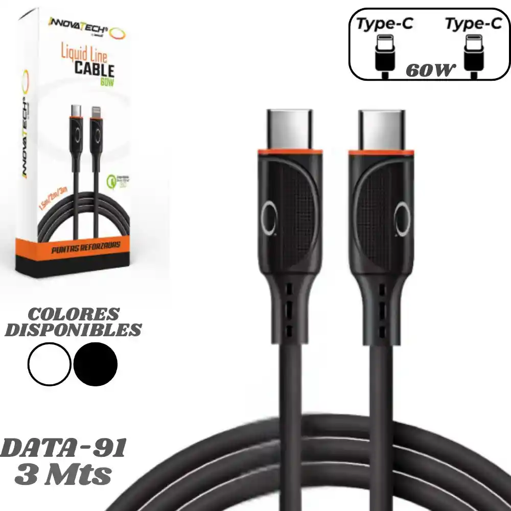 Cable Tipo C A Tipo C 3 Metros 60w Alta Calidad Innovatech Data-91 Potencia y durabilidad se combinan en el Cable de Carga Tipo C. Diseñado para quienes buscan una carga rápida y eficiente, este cable es el accesorio perfecto para mantener tus dispositivos siempre listos. Colores Disponibles: Blanco y Negro. NOTA: selecciona color de preferencia, en caso de no ser seleccionado, se enviará color sujeto a disponibilidad. Características: - Carga Rápida 60W: Este cable permite una carga rápida, optimizando el tiempo de recarga de tus dispositivos compatibles, ideal para aquellos que tienen un estilo de vida ajetreado. - Diseño Resistente: Su diseño robusto resiste alta presión y es anti-interferencia, lo que garantiza un funcionamiento óptimo incluso en condiciones exigentes. - Practicidad en el Uso: Ideal para cargar en casa, en la oficina o mientras viajas, su longitud de 3 metros proporciona flexibilidad y comodidad. Especificaciones: - Conector: Tipo C - Tipo C. - Longitud: 3 metros