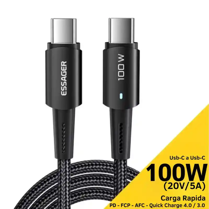 Cable Essager Carga Rapida PD 100W 20V5A Usb-C a Usb- C 2 en 1 - Carga Rápida / Cable de datos, 100W/20V/5A Max. Compatible con diferentes dispositivos: - Smartphone: iPhone - Samsung - Huawei - Xiaomi - Redmi Carga tu Huawei Mate 40 Pro al 85% en solo 30 Minutos - NoteBook: MacBook Pro - Dell Latitude/xPS - Xiaomi Air - Huawei MateBook - Hp EliteBook/Spectre/Z Book/Envy - Lenovo Yoga Carga tu MacBook Pro 16" en 2 horas Aprox. - Tablet: iPad Pro/Air/Mini - Galaxy Tab - Video Consolas: Nintendo Switch Protocolos de Carga Rapida Admitidos PD - Samsung AFC - Huawei FCP - Quick Charge 4.0/3.0 y otras tecnologias de Carga Rapida Carga Rápida compatible con: SAMSUNG Samsung A9/A20/A50/A51/A70/A71/A80 Samsung S8/S9/S10/S20/S21/S22/S23 Samsung Note 8/9/10/20 Samsung Z Flip - Z Fold Samsung Galaxy Tab S5e Samsung Galaxy Tab S+/S6 Lite Samsung Galaxy Tab S7/S7+ Samsung Galaxy Tab S8/S8+/S8 Ultra APPLE MacBook Pro 14" / 16" (2021) MacBook Pro M1 (2020) MacBook Pro 13.3" (2016/2017/2018/2019/2020) MacBook Pro 15.4" (2016/2017/2018/2019) MacBook Pro Air (2018/2019/2020/2022) iPad Pro Air 10.9" (2020/2022) iPad Mini 5/6 iPad Pro 11" (2018/2021) iPad Pro 12.9" (2019/2020/2021) iPhone 15 XIAOMI Xiaomi Air 12.5" Xiaomi Air 13.3" Xiaomi Air Pro 15.6" Xiaomi GameBook Xiaomi 9/10/11/12/13 Xiaomi Mi Mix 2/3/4 Redmi Note 10/11 Redmi K30/K40/k50 HUAWEI Huawei Mate 20/30/40/50 Huawei P30/P40/P50 Huawei Nova 7/8 Huawei Matebook X Pro Huawei Matebook 13 DELL Dell Latitude 7373/5570/5490/5400 (2019) Dell xPS13 / XPS15/Spectre x350 HEWLETT PACKADR EliteBook Follo G1/830 EliteBook x360 13 Spectre 13 Zbook/Zbook Studio LENOVO Lenovo Yoga 5 Lenovo C930 Lenovo ThinkPad-XL Nintendo Switch *-*-*-*-*-*-*-*-*-*-*-*-*-*-*-*-*-*-*-*-*-*-* ESPECIFICACIONES TECNICAS *-*-*-*-*-*-*-*-*-*-*-*-*-*-*-*-*-*-*-*-*-*-* Entrada: Usb-C Salida: Usb-C Corriente Máxima: (100W) 20V/5A Velocidad de Transmisión de Datos: 480Mbps Soporta: PD - AFC - FCP - Quick Charge 4.0/3.0 y otras tecnologias de Carga Rapida Material: Aleación de aluminio + Naylon trenzado. Tamaño: 2 Metros ***IMPORTANTE*** SU ADAPTADOR DEBE SER DE CARGA RAPIDA PARA QUE EL CABLE PUEDA FUNCIONAR CORRECTAMENTE, DE LO CONTRARIO FUNCIONARA A CARGA LENTA, SE RECOMIENDA USAR CON EL CARGADOR/ADAPTADOR ORIGINAL DE SU DISPOSITIVO. *-*-*-*-*-*-*-*-*-*-*-* QUE INCLUYE *-*-*-*-*-*-*-*-*-*-*-* - 1 Cable Carga Rápida 100W
