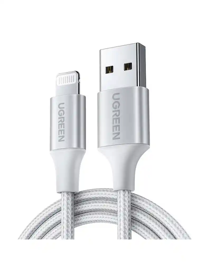 Este es el cable UGREEN MFi-Certified USB-A a Lightning con un elegante acabado plateado de aluminio, diseñado para la máxima compatibilidad y durabilidad con todos tus dispositivos Apple. La certificación MFi garantiza que el cable está 100% autorizado y es seguro para su uso. Características Clave Conectores: Cuenta con un conector USB-A estándar en un extremo y un conector Lightning de 8 pines en el otro. Certificación MFi: Autorizado oficialmente por Apple, lo que asegura compatibilidad total, carga segura y transferencia de datos sin errores ni mensajes de advertencia de "accesorio no compatible". Incorpora un chip original de Apple para proteger la batería de tu dispositivo. Carga Rápida y Sincronización: Soporta carga rápida de hasta 2.4 Amps (12W a 20W, dependiendo de la longitud del cable). Velocidad de transferencia de datos de hasta 480 Mbps (USB 2.0). Durabilidad Superior: Construido para durar, con un exterior de nailon trenzado premium y conectores de aleación de aluminio que resisten el desgaste diario. Diseñado para soportar múltiples ciclos de flexión y conexión. Amplia Compatibilidad: Funciona perfectamente con una amplia gama de productos Apple que utilizan el puerto Lightning, incluyendo diversos modelos