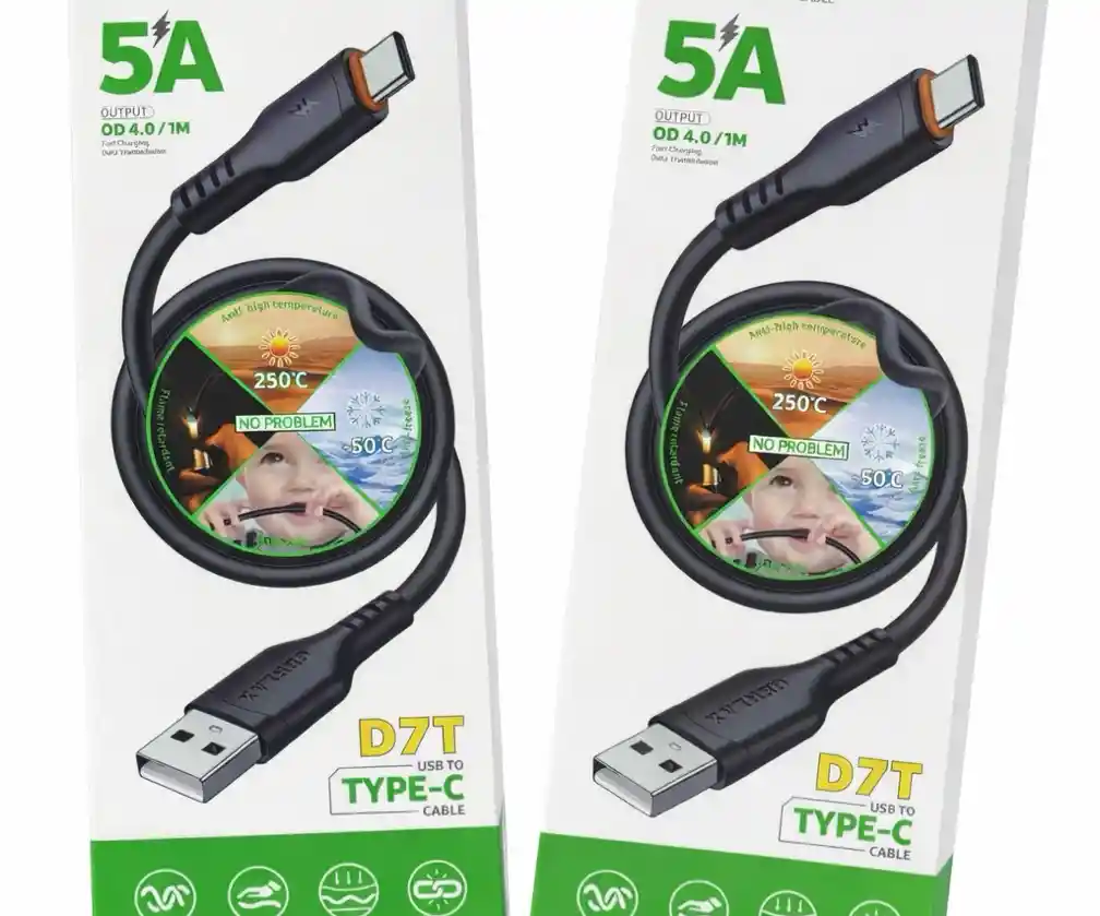 Cable USB a Tipo-C 5A D7T Descripción del producto: Este es un cable USB a Tipo-C modelo D7T, diseñado para carga rápida y transferencia de datos. Soporta una corriente de hasta 5A y tiene una longitud de 1 metro con un grosor de OD 4.0 mm. Alta resistencia a la temperatura: soporta hasta 250°C y temperaturas bajas de hasta -50°C. Diseño duradero: recubrimiento y conectores reforzados para mayor vida útil. Compatibilidad: adecuado para dispositivos con puerto USB Tipo-C. Funciones: carga rápida y transmisión de datos estable. Indicadores gráficos: íconos en la parte inferior muestran resistencia, velocidad y compatibilidad. Este cable es ideal para quienes necesitan un accesorio confiable para cargar y sincronizar dispositivos con conector Tipo-C.