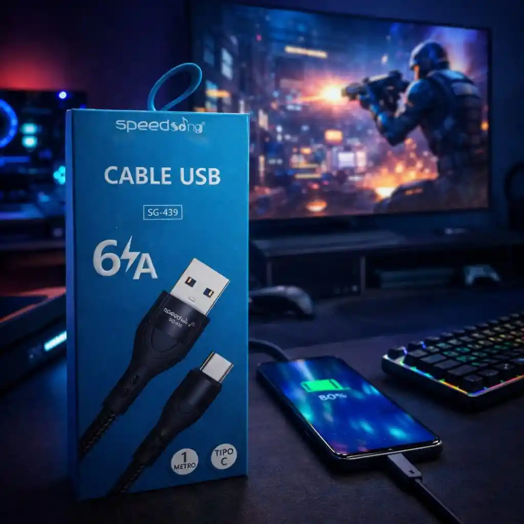 Cable USB a Tipo C SpeedSong referencia SG-439, diseñado para ofrecer carga rápida y transmisión estable de energía para celulares y dispositivos compatibles. Soporta hasta 6A de potencia, permitiendo una carga más eficiente para dispositivos compatibles con carga rápida. Su diseño con recubrimiento reforzado mejora la durabilidad y resistencia al uso diario. Con 1 metro de longitud, es ideal para utilizar en casa, oficina o mientras juegas, trabajas o utilizas tu celular. Características * Marca: SpeedSong * Referencia: SG-439 * Tipo de conexión: USB a Tipo C * Carga rápida: hasta 6A * Longitud: 1 metro * Cable reforzado para mayor durabilidad * Compatible con celulares, tablets y dispositivos con puerto Tipo C Contenido del paquete * 1 Cable USB a Tipo C SpeedSong SG-439 de 1 metro