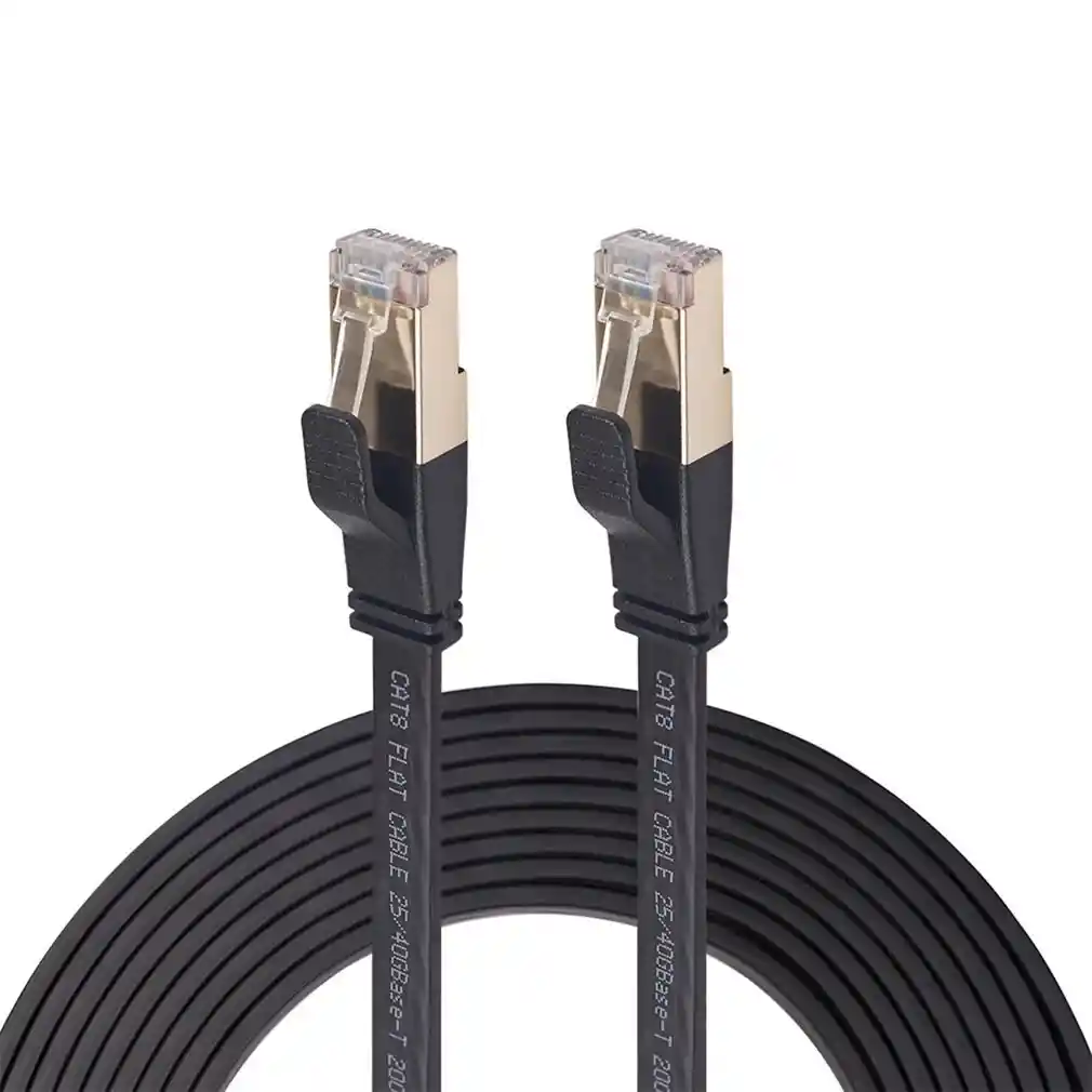Cable Ethernet Cat 8 SFTP 40Gbps supervelocidad FLAT Cat 8 red Cable de conexión LAN con conector RJ45 chapado en oro Características: Recubierto en PVC ecológico de alta elasticidad y 26AWG OFC, alcanzando el estándar CAT 8 Especificaciones: Color: Negro Longitud: 3 metros Diámetro exterior del cable: 9*3mm Especificación del cable: 28AWG cobre libre de oxígeno para 0,5-7,6 m 26AWG cobre libre de Oxígeno para 10-20m Tipo de conector: RJ45 Ancho de banda: 2000MHz Velocidad de transmisión: 40gbps Distancia de transmisión: estándar de 40gbps dentro de 30 metros Secuencia de cables de red: T568B recta estándar Tipo de envío: SFTP Material del producto: Alambre de PVC altamente flexible y respetuoso con el medio ambiente, conductor de cobre libre de oxígeno OFC americano de 26AWG. USO DEL PRODUCTO: Ampliamente utilizado en ordenadores, cuadernos, duchas, interruptores, televisores, decodificadores, cámaras, NAS de almacenamiento de red, servidores y otros equipos.