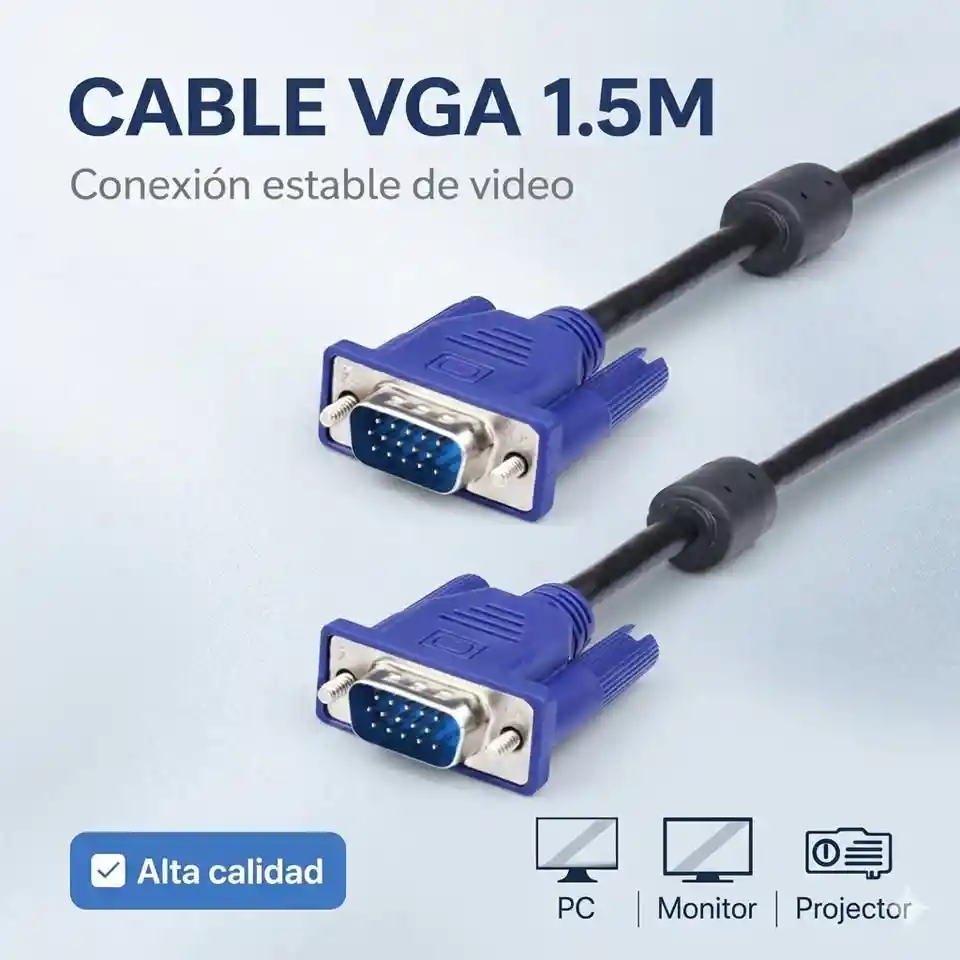 ¿Tu monitor no da imagen o el cable viejo falló? 🖥️🔌 No dejes tu trabajo o presentación para después. Con este Cable VGA de 1.5 metros, recuperas la señal de video con alta calidad y estabilidad de inmediato. ✅ COMPATIBILIDAD TOTAL: Monitores LED/LCD: Perfecto para cualquier marca (Samsung, LG, Dell, etc.). Proyectores: Ideal para salones de clase u oficinas. CPU y Laptops: Conexión estándar de 15 pines. CARACTERÍSTICAS TÉCNICAS: Longitud: 1.5 Metros (distancia estándar de escritorio). Conectores: Macho a Macho con tornillos de seguridad. Calidad: Puntas reforzadas para evitar interferencias y sombras en la imagen. Fácil Uso: Solo conecta y asegura los tornillos. cable vga, monitor pc, cable monitor, vga 1.5m, accesorios pc cali, cable proyector, vga macho a macho, repuestos computador cali, aurexa tech, tecnologia cali, cable vga cali, adaptador monitor, cables video