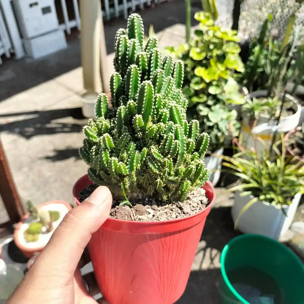 Apariencia: Crece formando múltiples brotes verticales de diferentes tamaños, lo que le da una apariencia de torres o almenas de un castillo. Espinas: Tiene espinas pequeñas y generalmente blancas, no es una planta muy espinosa. Cuidado: Prefiere pleno sol o luz filtrada brillante y requiere un sustrato con excelente drenaje. Riego: Se debe regar únicamente cuando el sustrato esté completamente seco para evitar la pudrición de las raíces. Crecimiento: Es una planta de crecimiento lento que puede alcanzar hasta 1.8 metros de altura en condiciones ideales