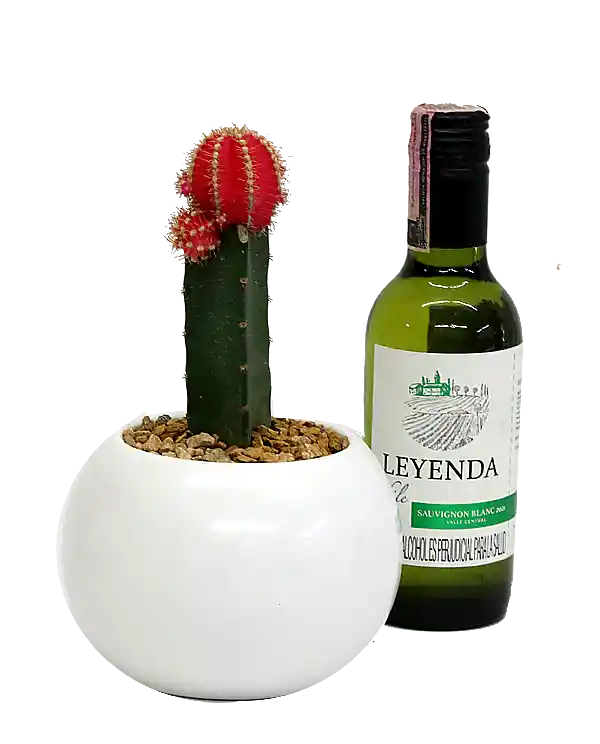 Cactus ornamental de colores variados, viene acompañado de una botella de vino chileno Sauvignon Blanc, de tamaño personal. Incluye matera.