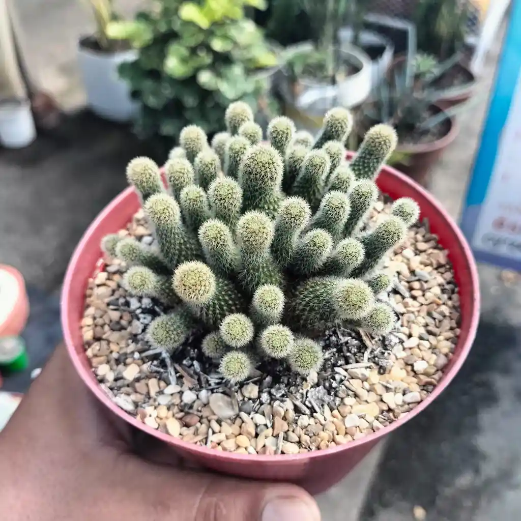 Características: Es un cactus compacto que forma agrupaciones de tallos cilíndricos cubiertos de espinas doradas o rojizas. Cuidados: Prospera en pleno sol y requiere suelo con buen drenaje. Uso: Es una opción popular de bajo mantenimiento tanto para interiores como exteriores.