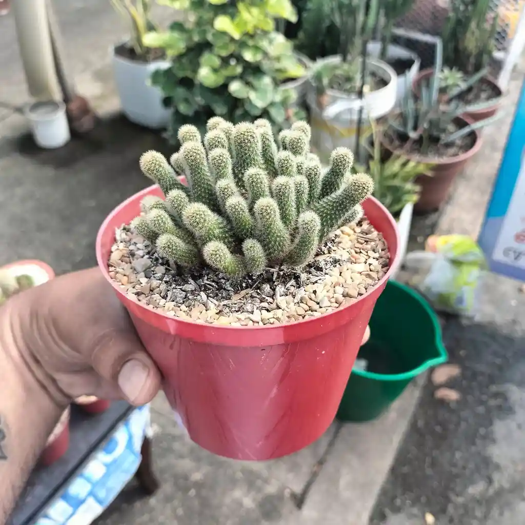 Características: Es un cactus compacto que forma agrupaciones de tallos cilíndricos cubiertos de espinas doradas o rojizas. Cuidados: Prospera en pleno sol y requiere suelo con buen drenaje. Uso: Es una opción popular de bajo mantenimiento tanto para interiores como exteriores.