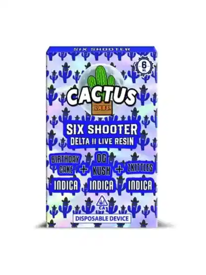 Experimente la máxima indulgencia del vapeo con el Cactus Labs Six Shooter D11 Live Resin Disposable Birthday Cake | OG Kush | Zkittles. Además, este dispositivo desechable de primera línea cuenta con una cantidad de 6 gramos de Delta-11 derivado del cáñamo de alta calidad, terpenos derivados de plantas y sabores naturales.