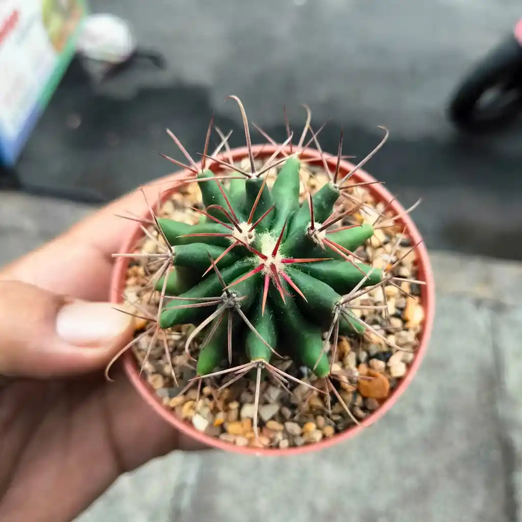 Posee cuerpo globular, como es típico en este género, con la parte superior deprimida y plana, de color verde grisáceo. Las costillas son estrechas, entre 8 y 14, aunque con la edad llegan a aumentar hasta 23. Las areolas surgen en protuberancias a lo largo de las costillas, grandes y de forma redondeada con lanosidad grisácea. Tiene entre 6 y 12 espinas radiales blancas o rojizas de 2 a 2,5 cm de largas, con estrías transversales.