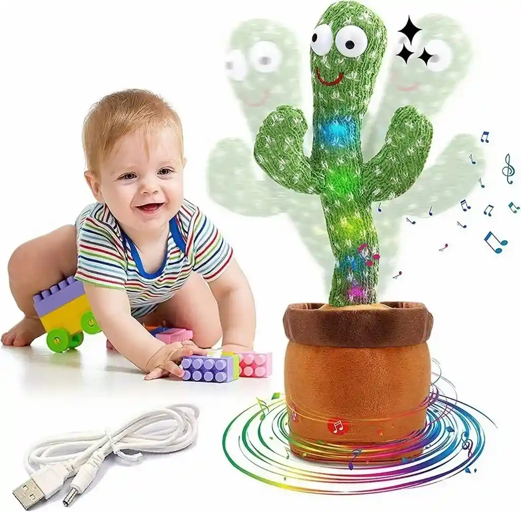 A este curioso y expresivo cactus le gusta jugar durante todo el día. Juega con este divertido cactus de peluche que canta, baila y repite lo que dices, con más de 40 canciones y una batería recargable durarás horas jugando con él. NOTA: Una vez realices la compra enviamos un mensaje con el motivo deseado (escoger #) y así verificaremos su disponibilidad. Características: • Material: Felpa. • Tamaño Aprox.: 32 X 12 x 12 cm. • Peso Aprox.: 205g. • Funcionamiento: Recargable cable USB (Incluido) • Interesante juguete de peluche en forma de cactus que puede bailar, cantar, brillar y repetir lo que escucha. • Este producto utiliza una tela de felpa no tóxica e inofensiva, la tela es suave, cómoda y no causará ningún daño. Usted y su hijo pueden jugar con confianza. • Apto para la educación temprana. El juguete bailará al ritmo y atraerá la atención del niño. • El Juguete Bailará con el ritmo, atrayendo la atención de los niños y aumentando su concentración y su creatividad. • Presiona el botón de la izquierda y habla con este divertido cactus que repetirá lo que dices con una voz graciosa. • Con más de 40 canciones fijas, tu hijo nunca se aburrirá de este asombroso juguete. • El mejor regalo para los niños: Este lindo juguete de felpa de cactus será el regalo perfecto para llevar alegría a la gente. Es el mejor regalo de cumpleaños para los niños. Contenido del Paquete • 1 Juguete de cactus Bailarín. • 1 Cable USB. • 100 % Nuevo