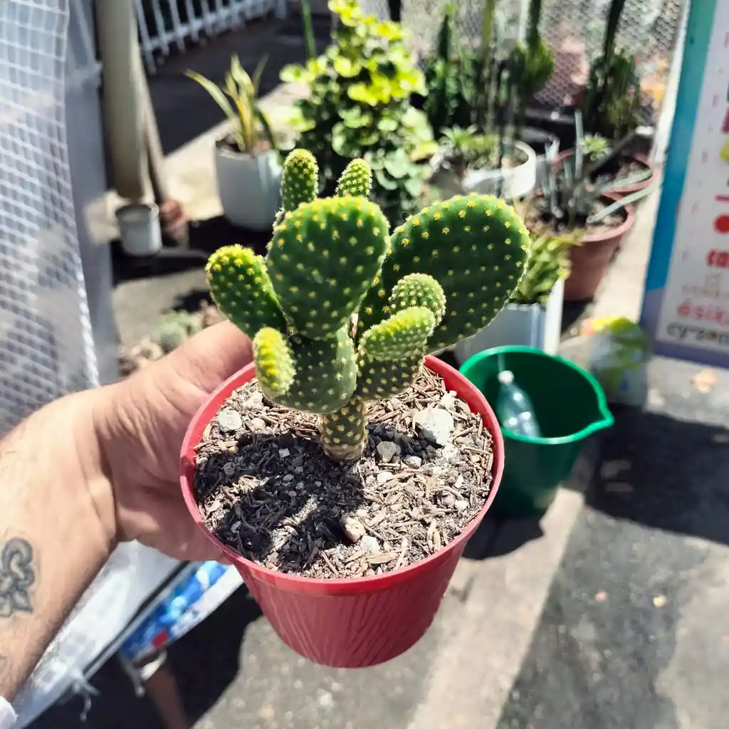 Características: Presenta paletas planas cubiertas de diminutas espinas amarillas llamadas gloquidios, que asemejan vellosidades. Precaución: Estas espinas son peligrosas si se tocan, ya que se adhieren fácilmente a la piel, causando irritación y dolor. Cuidados: Requiere abundante sol y un sustrato con excelente drenaje para evitar la pudrición, siendo una planta de bajo mantenimiento.