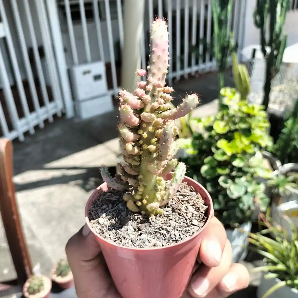 Características únicas: Presenta una forma "crestada", lo que significa que sus ramas crecen en patrones de abanico o espirales en lugar de forma cilíndrica. Coloración: Esta variedad suele tener tonos rosados, blancos y verdes. Cuidado: Requiere pleno sol o sombra parcial y suelo con excelente drenaje. Toxicidad: No se conoce que sea tóxico para humanos o mascotas, pero sus espinas pueden causar lesiones físicas.