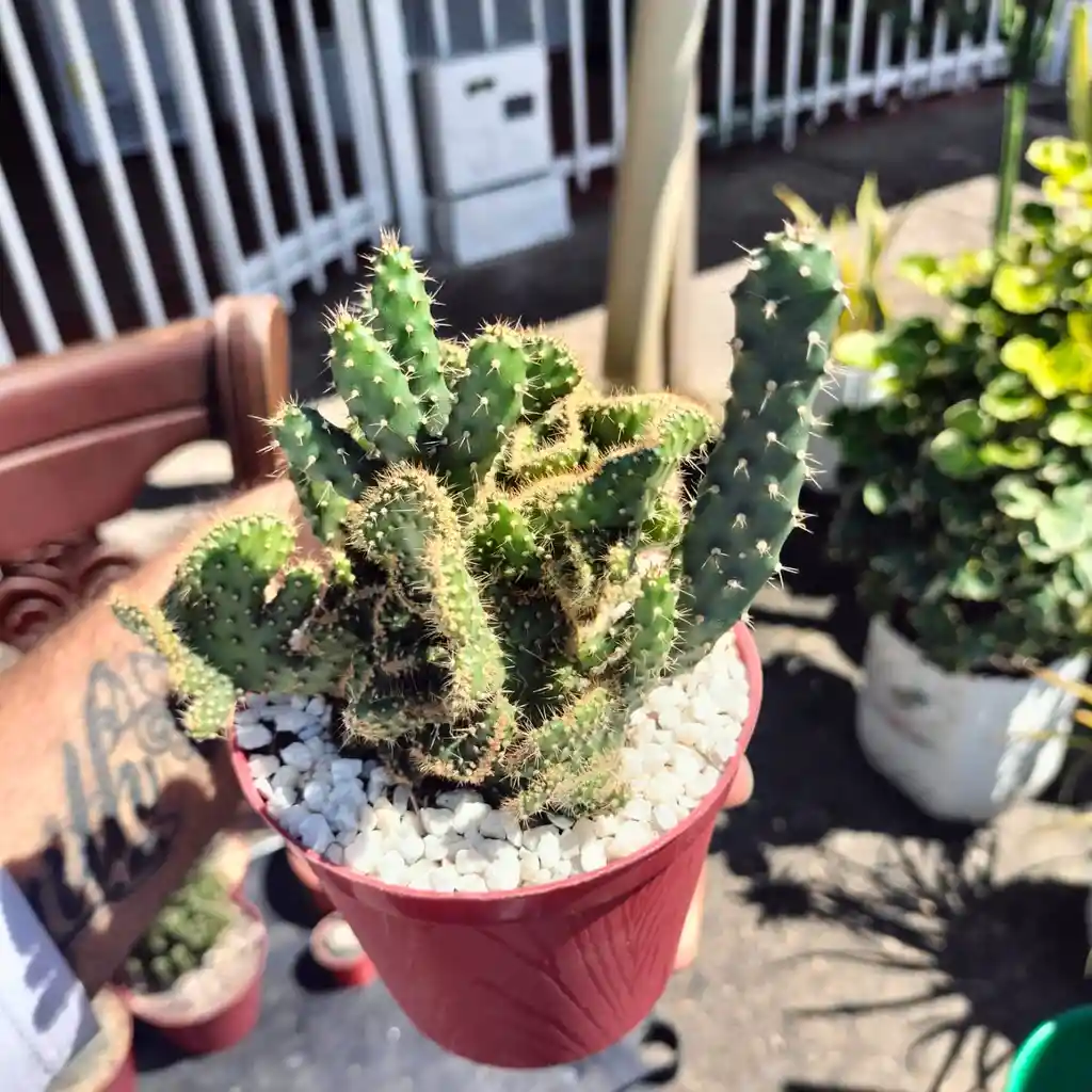 Forma: Su apariencia inusual y ondulada se debe a una mutación llamada crestación, donde el cactus crece de forma continua en lugar de producir nuevas pencas individuales. Origen: Este tipo de forma es seleccionada y propagada en viveros y no suele encontrarse en estado silvestre. Cuidados: Requiere sustrato suelto, poco arenoso y con buen drenaje para evitar que se pudra la raíz. Luz: Necesita varias horas de sol directo al día para crecer sano.