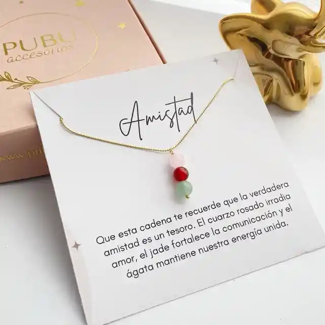 C38-12 🤝 Collar "Amistad" - Un Tesoro Compartido Celebra ese vínculo inquebrantable con un detalle lleno de significado. Esta cadena es el recordatorio perfecto de que la verdadera amistad es un tesoro que merece ser llevado cerca del corazón. Significado de las piedras: 💖 Cuarzo Rosado: Irradia amor y ternura incondicional. 🌿 Jade: Fortalece la comunicación y la armonía. ❤️ Ágata: Mantiene la energía unida y en equilibrio. Características del producto: Diseño: Cadena en acero fina con tres cristales naturales seleccionados. Presentación: Incluye tarjeta con mensaje especial y caja de marca. Regalo ideal: Perfecto para tu mejor amiga, hermana o esa persona que siempre está para ti.