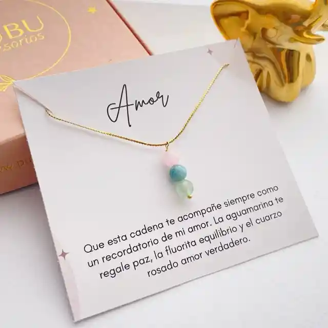 C38-16 💖 Collar "Amor" - Piedras Naturales Regala un detalle con propósito. Esta delicada cadena combina la energía de tres cristales naturales para acompañar a esa persona especial en su día a día. Significado de las piedras: ✨ Cuarzo Rosado: Amor verdadero y ternura. 🌊 Aguamarina: Paz y serenidad. ⚖️ Fluorita: Equilibrio y protección. Características: -Cadena delgada en acero. -Incluye tarjeta decorativa con mensaje inspirador. -Listo para regalo: Ideal para aniversarios, cumpleaños o una sorpresa espontánea.