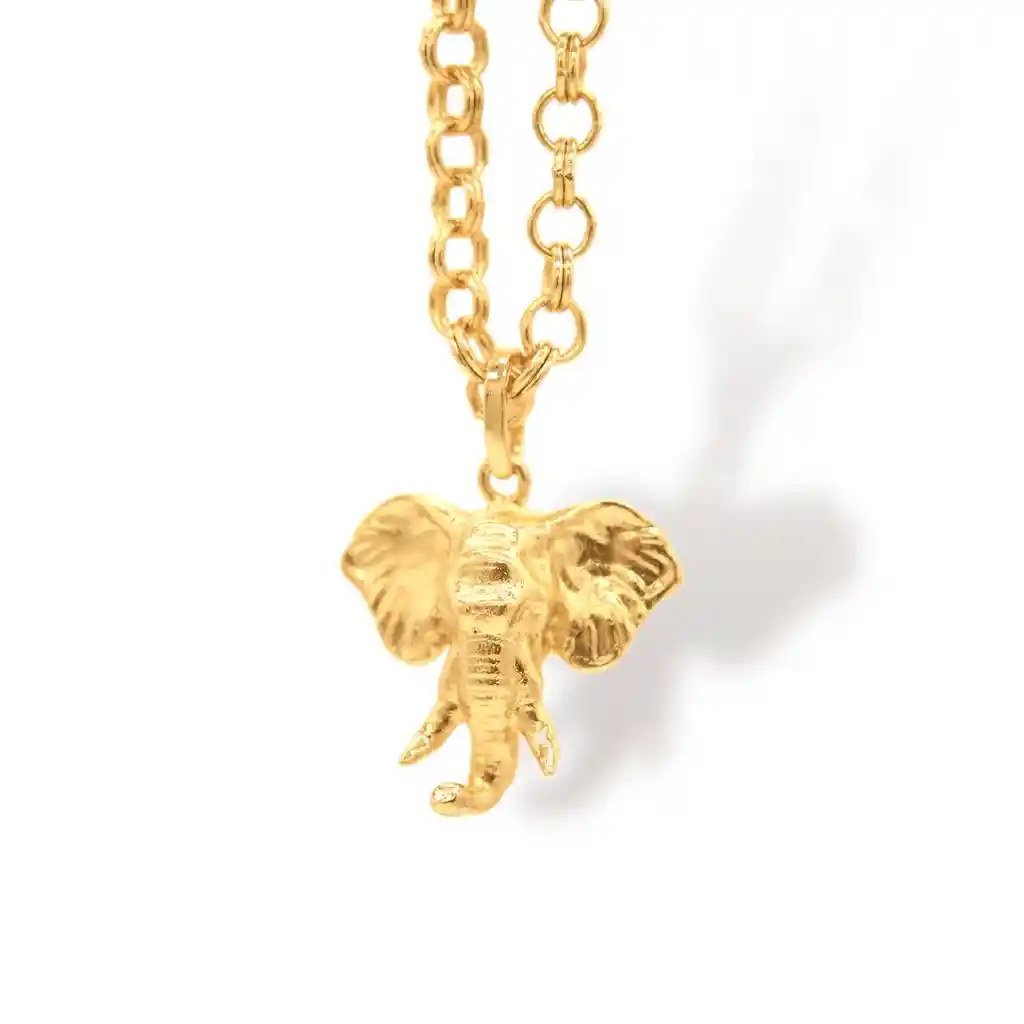 Es un grueso collar con un colgante de cabeza de elefante, símbolo de fuerza, sabiduría, lealtad e inteligencia. Diseñado y elaborado artesanalmente en bronce y oro de 24 kilates. Este precioso collar es el regalo perfecto para cualquier mujer que quiera mostrar un estilo único.